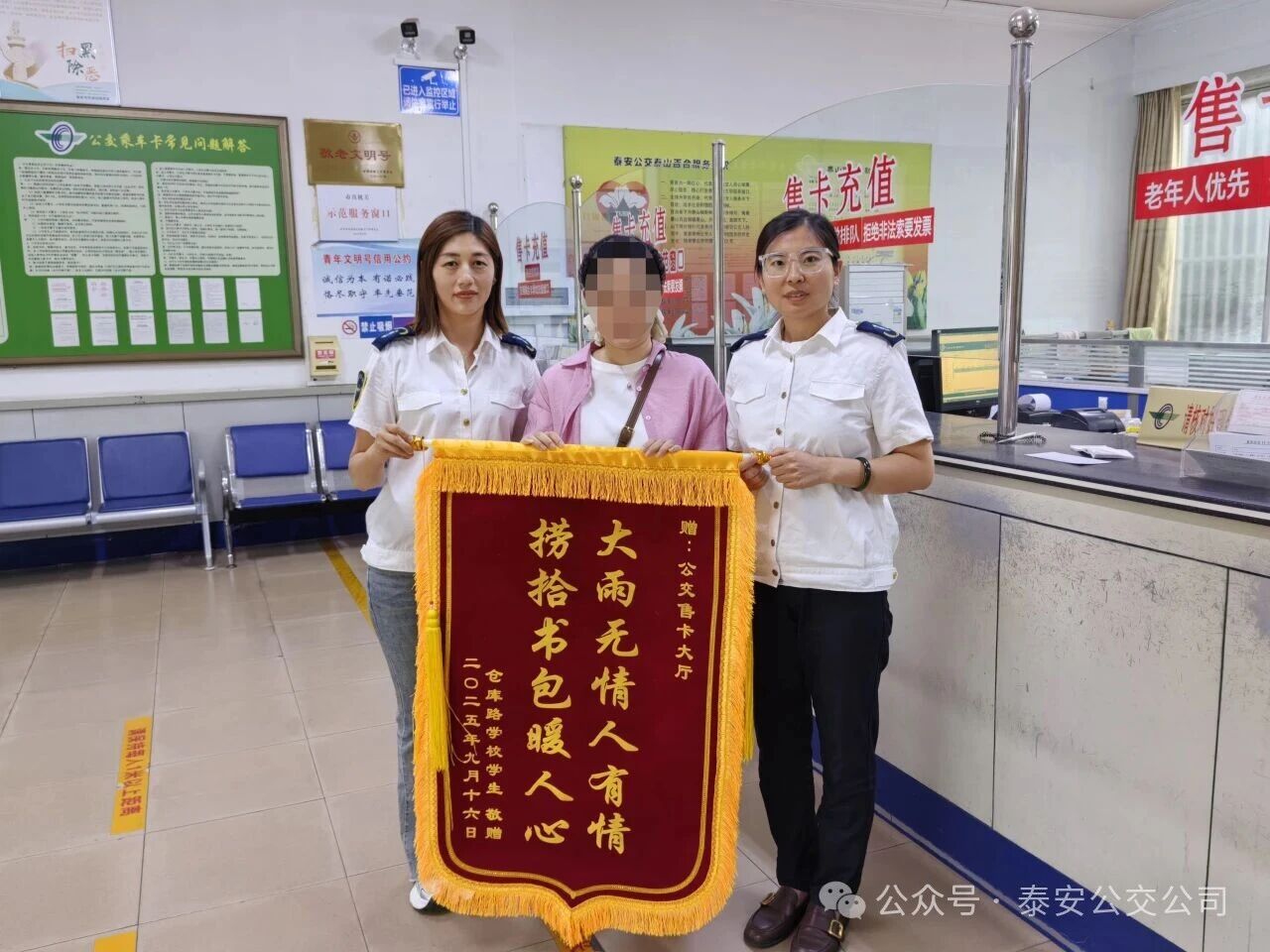 第二天下午,家長特意帶著一面錦旗來到泰山百合服務(wù)廳,贈予大廳工作人員,贊揚(yáng)她們“大雨無情人有情 撈拾書包暖人心”的暖心行為。面對家長的堅(jiān)持,工作人員接過錦旗,心里涌起一陣溫暖——沒想到這小小的舉手之勞,能收獲家長如此真摯的肯定。