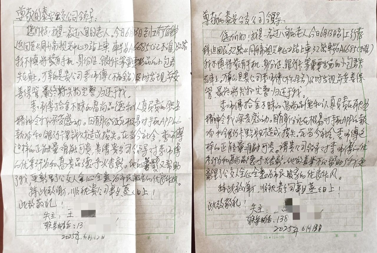 當(dāng)天,王大娘順利領(lǐng)回失物。她感慨道:“李師傅不僅拾金不昧,還主動(dòng)聯(lián)系、妥善保管,讓我這八旬老太太心里特別暖。”為表謝意,老人特意手寫感謝信,一份致謝公交公司,一份致敬李師傅,用質(zhì)樸的文字傳遞社會(huì)正能量。