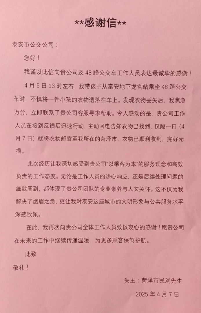 4月10日,泰安公交第三分公司收到了一份裝有感謝信的郵政快遞。事情是這樣的,菏澤的劉先生來泰安旅游乘坐公交車時(shí),孩子不慎將衣服丟失,泰安公交人及時(shí)幫助找回,并將衣服郵寄到菏澤歸還。劉先生收到孩子的衣服后,非常感動(dòng),專門寫了一封感謝信,郵寄到泰安公交,對(duì)駕駛員及工作人員表示由衷的感謝。