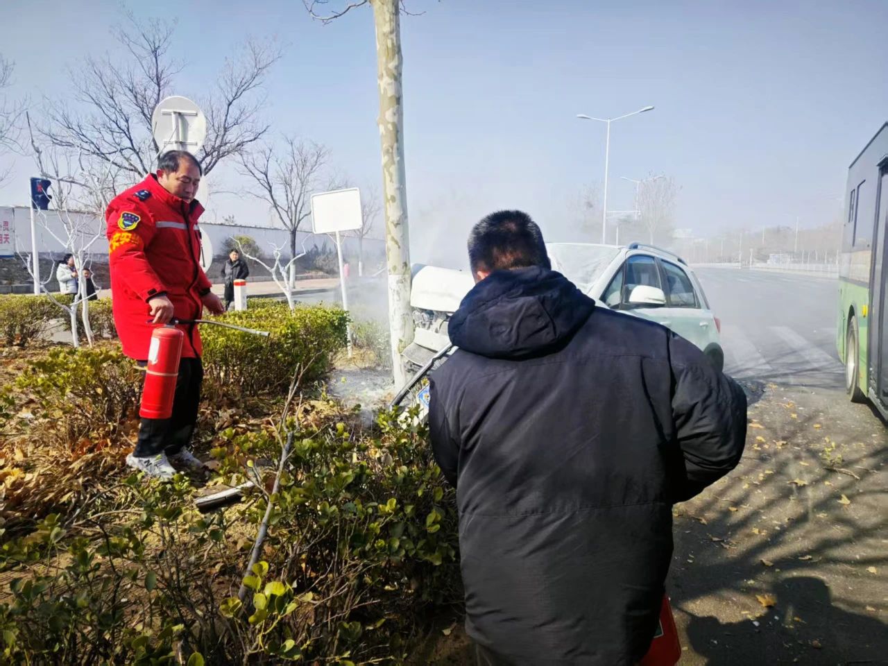 千鈞一發(fā)之際,16路公交駕駛員肖安法駕駛公交車恰好途經(jīng)此處。他敏銳的目光瞬間捕捉到了這一險情,沒有絲毫猶豫,迅速做出反應(yīng),果斷將公交車穩(wěn)穩(wěn)??吭诼愤叞踩恢?。肖安法深知時間就是生命,每一秒都至關(guān)重要,他心急如焚,立刻拎起公交車上配備的滅火器,以最快的速度沖向事故車輛。此時,冒煙的私家車隨時可能發(fā)生自燃,周圍彌漫著緊張的氣息,但肖安法毫不畏懼,迅速靠近車輛,熟練地操作滅火器,對準(zhǔn)冒煙部位全力噴射。
