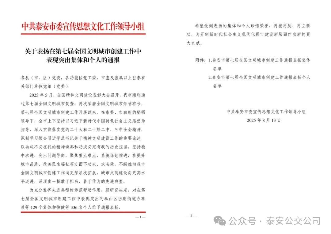 泰安公交此次榮獲表揚,是對泰安公交以“小窗口”賦能城市“大文明”創(chuàng)建實踐的充分肯定。下一步,泰安公交將珍惜榮譽、再接再厲,持續(xù)深化文明創(chuàng)建工作,鞏固文明創(chuàng)建成果,提高人民群眾滿意度,在文明城市創(chuàng)建中攀登公交整體文明建設(shè)新高度,為全國文明城市增光添彩。