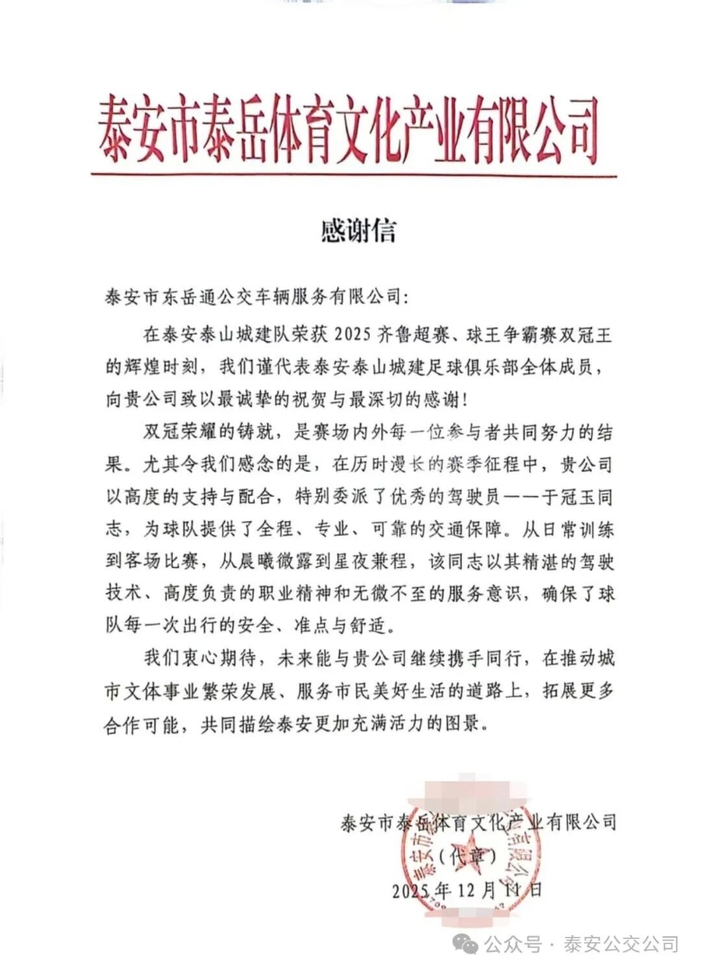 12月19日,泰安市泰岳體育文化產(chǎn)業(yè)有限公司向泰安公交東岳通公交車輛服務有限公司發(fā)出一封真摯的感謝信,對其在球隊奪冠征程中提供的堅實交通保障給予高度評價,并特別對駕駛員于冠玉同志的專業(yè)服務與奉獻精神提出表揚。